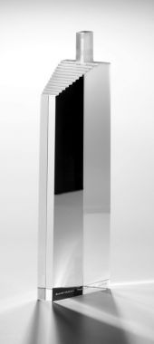 Designed by sculptor David P. Dowler, this pristinely clear, elegant, cut and polished crystal column is made entirely by hand at Steuben Glass. It evokes the geometric form of Wright's Blue Sky Mausoleum and reflects transcendence and organic form in harmony with nature – fundamental Wright concepts. The stepped surfaces and the sides of the monolith are lightly textured, like the Bethel white granite used in the Blue Sky Mausoleum. The image is reflected throughout the sculpture, repeating and floating within the crystal.
